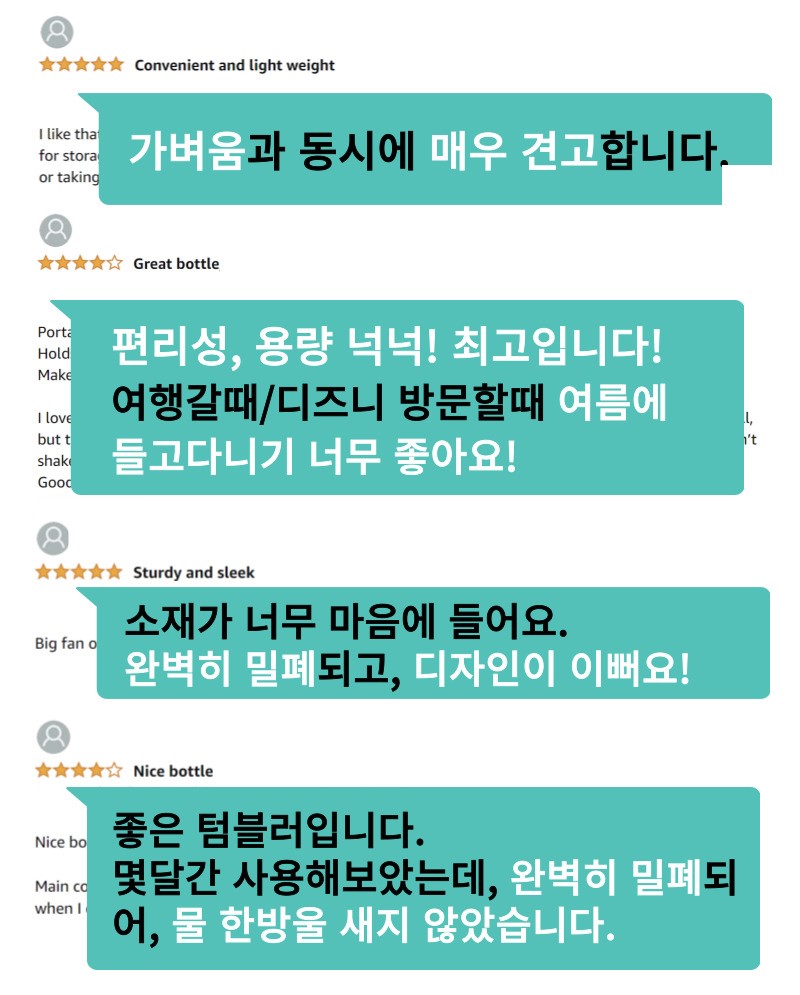 스테인레스 스틸에서는 쇠 냄새, 실리콘에서는 고무 비슷한 냄새.. 겪어보신적 있나요? FDA, EU1935/2004 특허 소재로 (1)무취 (ODOR-FREE) , (2)독소 없는 (TOXIN-FREE) 안정성 검증된 소재입니다. 물 마실 때 더 이상 냄새 때문에, 과연 안전한 소재인가 불안에 떨면서 텀블러 사용하지 마세요!