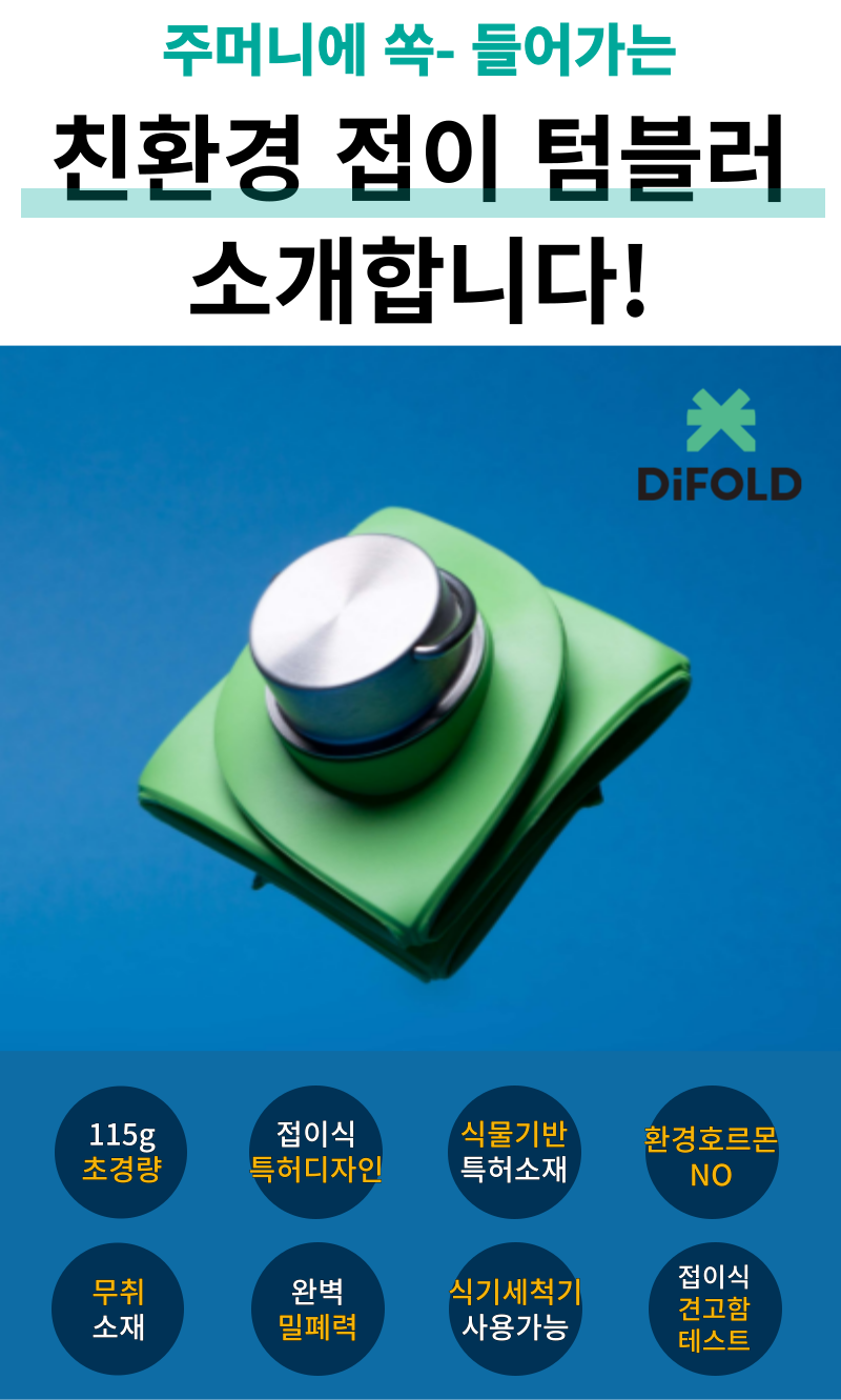 주머니에 쏙 들어가는 텀블러가 있다면 얼마나 좋을까요? DiFOLD는 수많은 연구 끝에 주머니 속에 들어가는 사이즈의 텀블러를 개발했습니다. 750ml, 높이 약 21cm 인 텀블러가 접는 순간  약 5.5cm까지 줄어듭니다.  무게는 캡 포함 약 115g 정도 입니다.