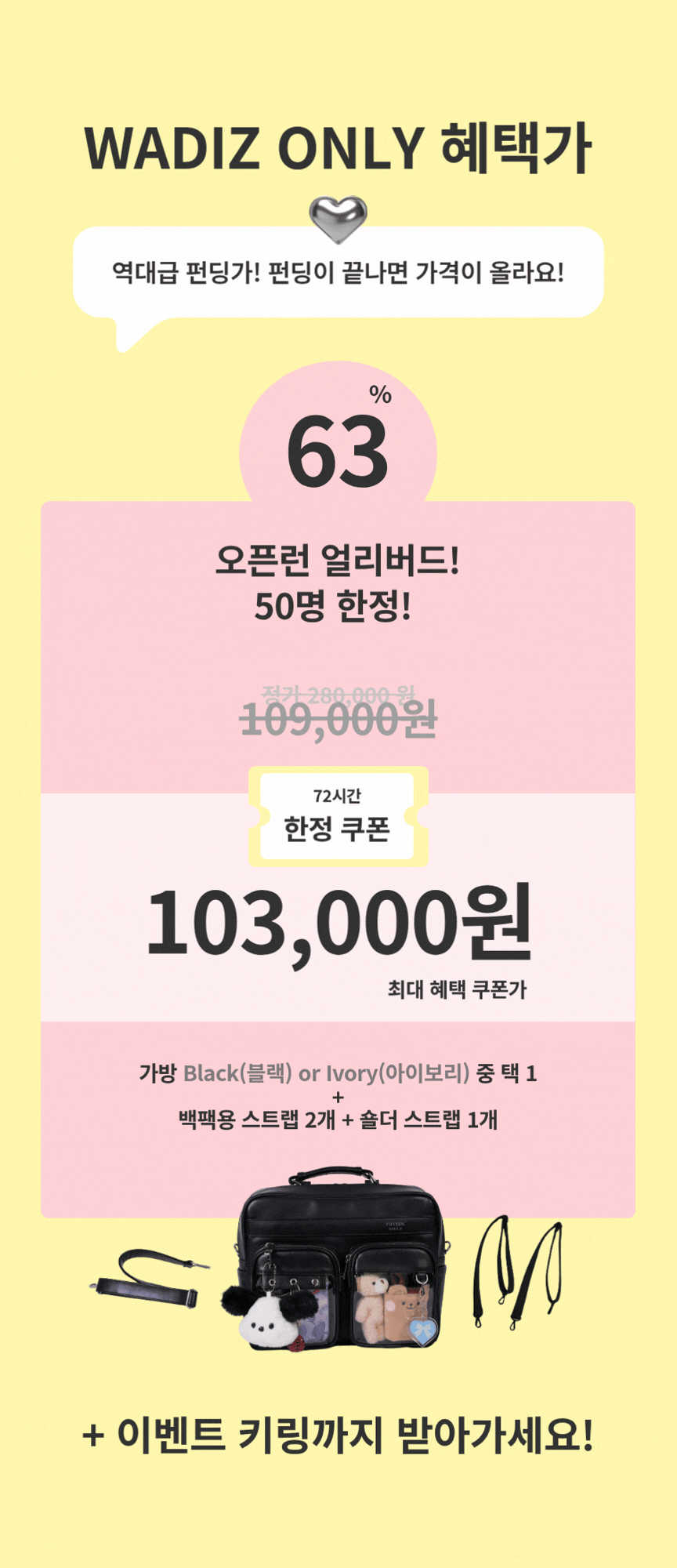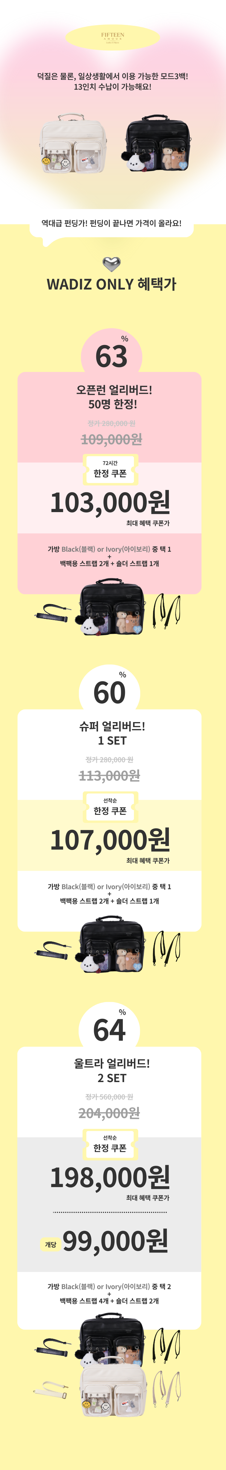 소규모로 활동하는 디자이너나 개인 디자이너들이 자신의 작품을 소개 할 기회가 많이 없습니다 .이런 점을 와디즈와 함게라면 조금 더 믿음을 갖고, 결실을 맺기에 믿을 수 있는 와디즈 펀딩을 선택 했습니다. 또한 시중에서 볼 수 없는 유니크한 가방을 만들어 펀딩이란 가치 있는 프로젝트로 더욱 많은 서포터님들과 만나고자 펀딩을 결정 했습니다.