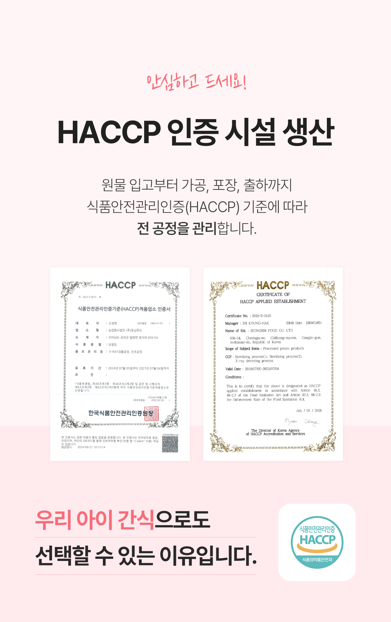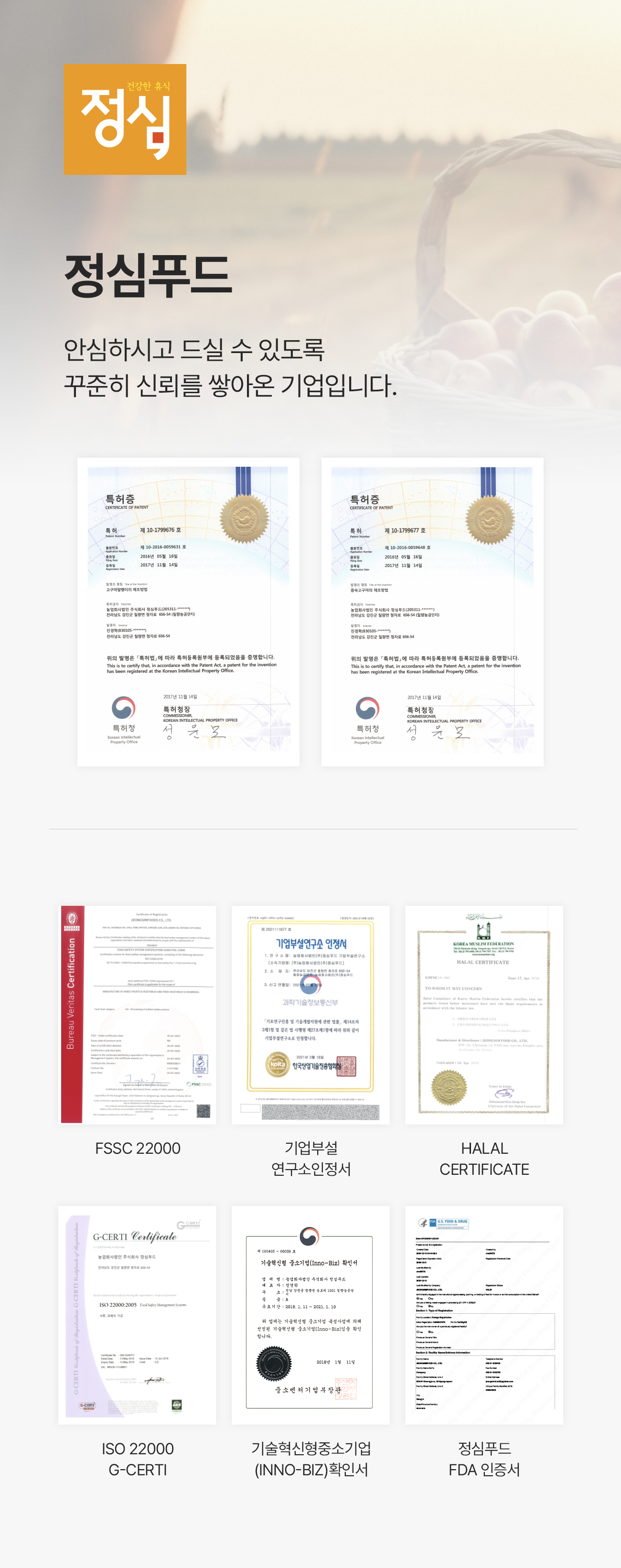 정심푸드의 건조식품 또한 미국,영국,캐나다,일본,태국으로 수출하여 전세계인들에게 새로운 먹거리로 사랑받고 있습니다. 모든 식품들은 검증된 생산시설을 통해 건강하고 안전한 식품으로 생산되어 고객들과 만나게 됩니다. 안심할 수 있는 생산 과정 그리고 바른 먹거리를 추구하는 마음이 더해져 정심푸드의 품질을 만들어 갑니다.