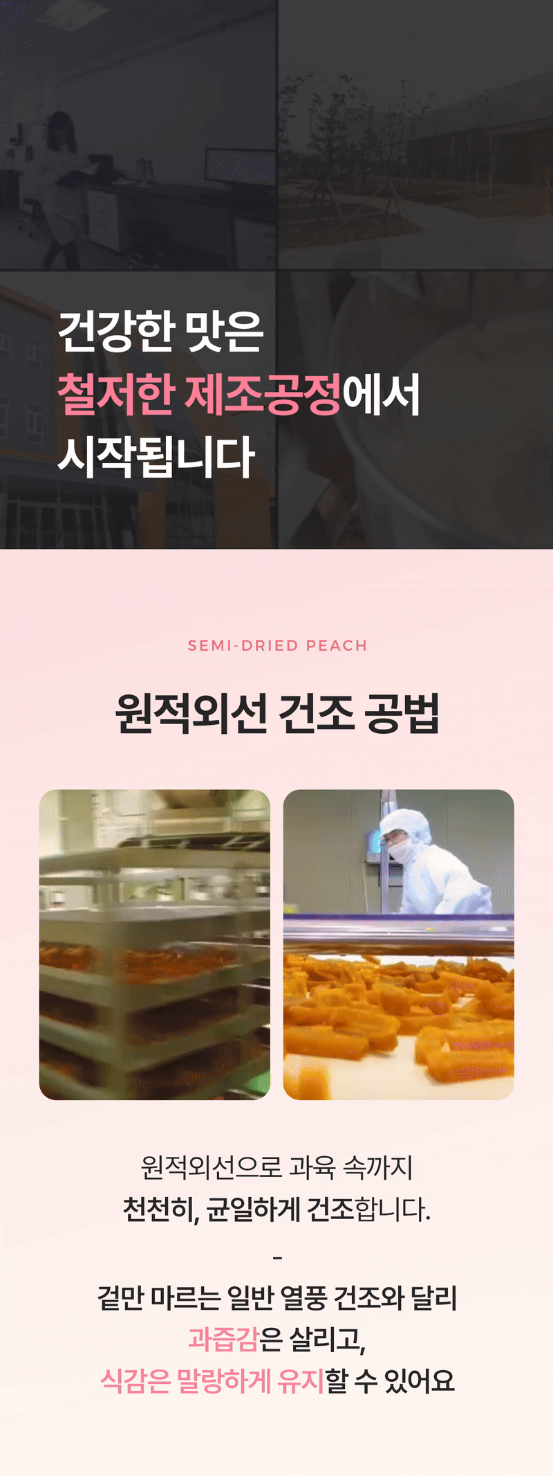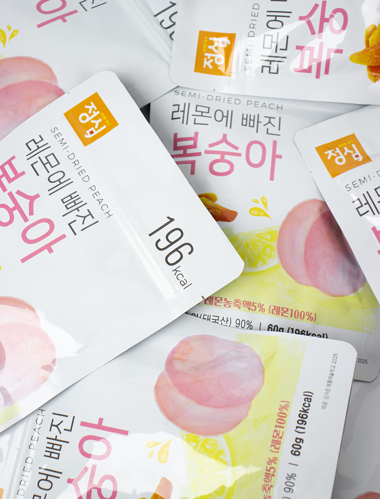 고구마,망고,복숭아 말랭이 등 온 가족이 건강하게 먹을 수 있도록 원물 그대로 순수 건조식품을 만들고 있습니다. 고객의 신뢰를 마음에 새기고 자연 그대로의 먹거리를 구현하여 변함없이 바른 먹거리만을 제공하는 것이 정심푸드만의 경영철학입니다.