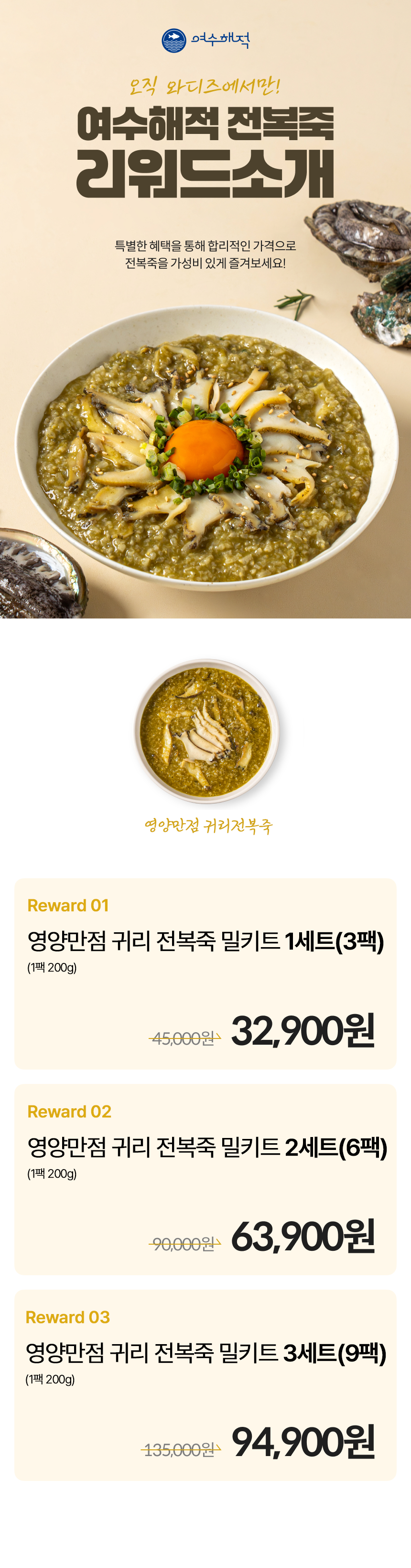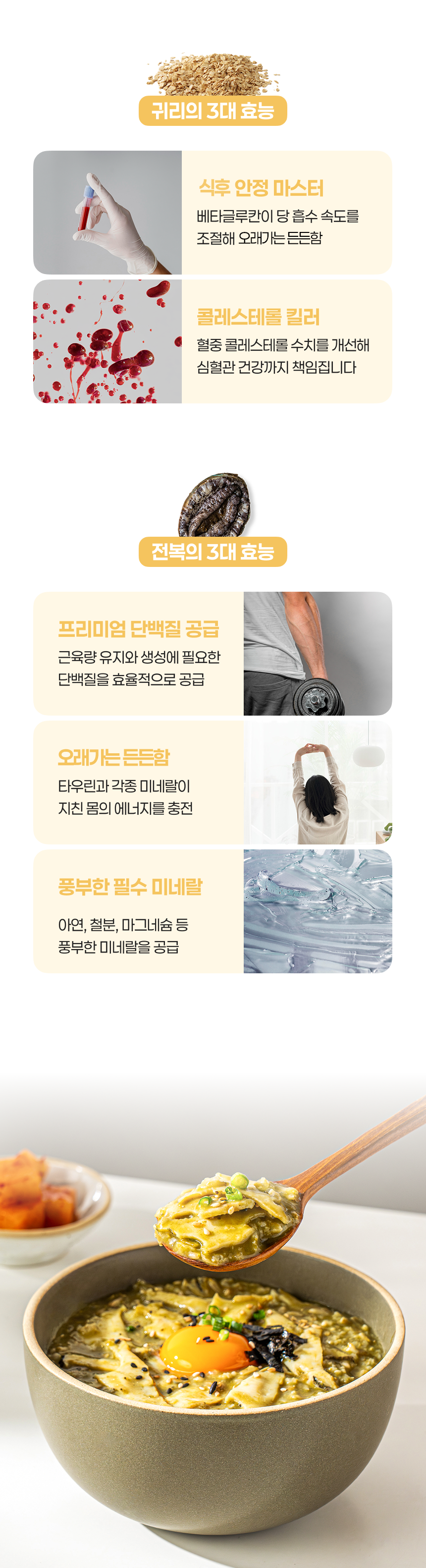 1. 🍲 燕麦鲍鱼粥料理包 - 鲍鱼鲜香与燕麦平衡融合的一碗料理 2. 🦪 珍岛鲍鱼满满装入 - 新鲜珍岛鲍鱼带来更丰盛的口感 3. 🎁 限量组合优惠 - 3套装与9包装提供特别折扣