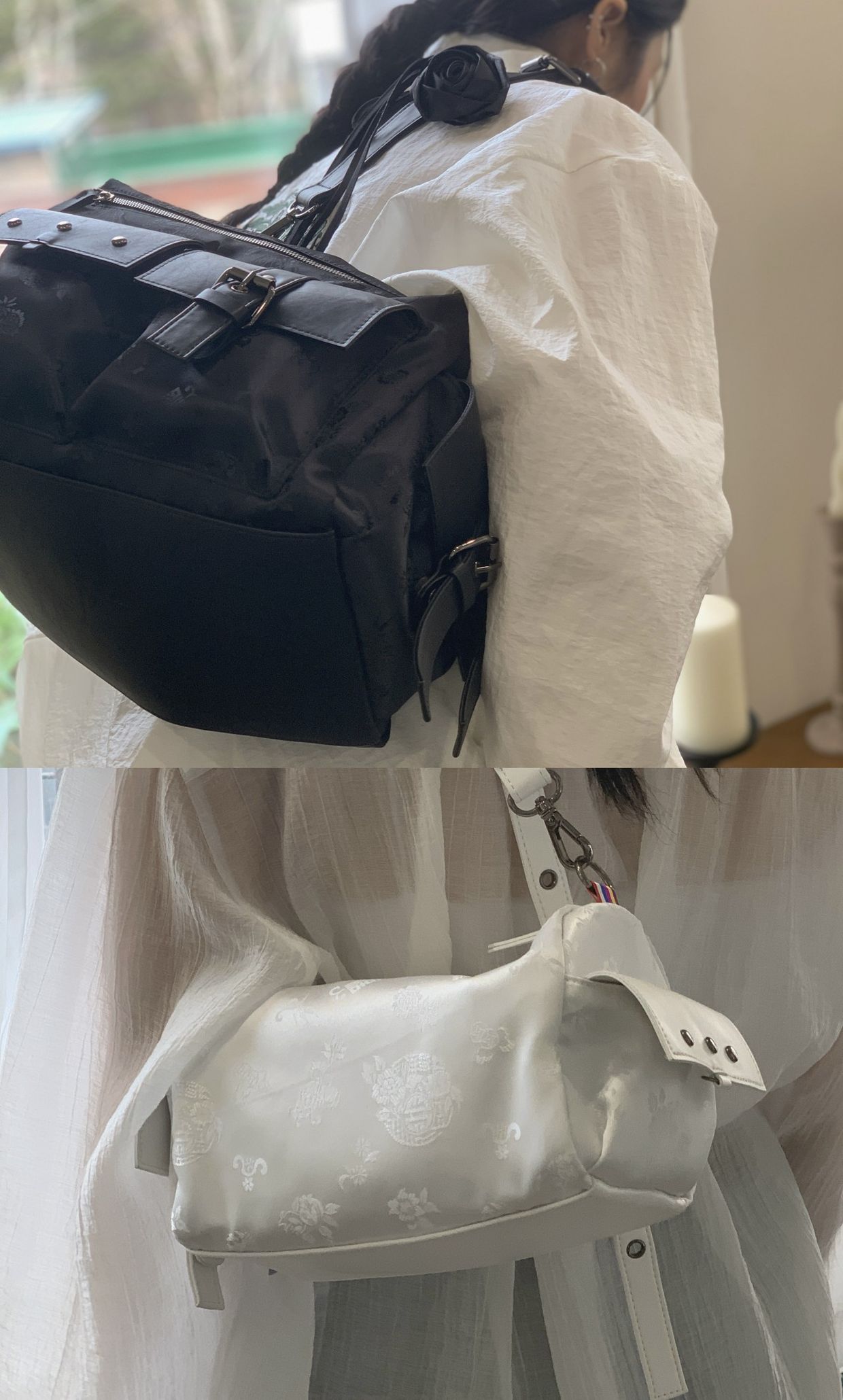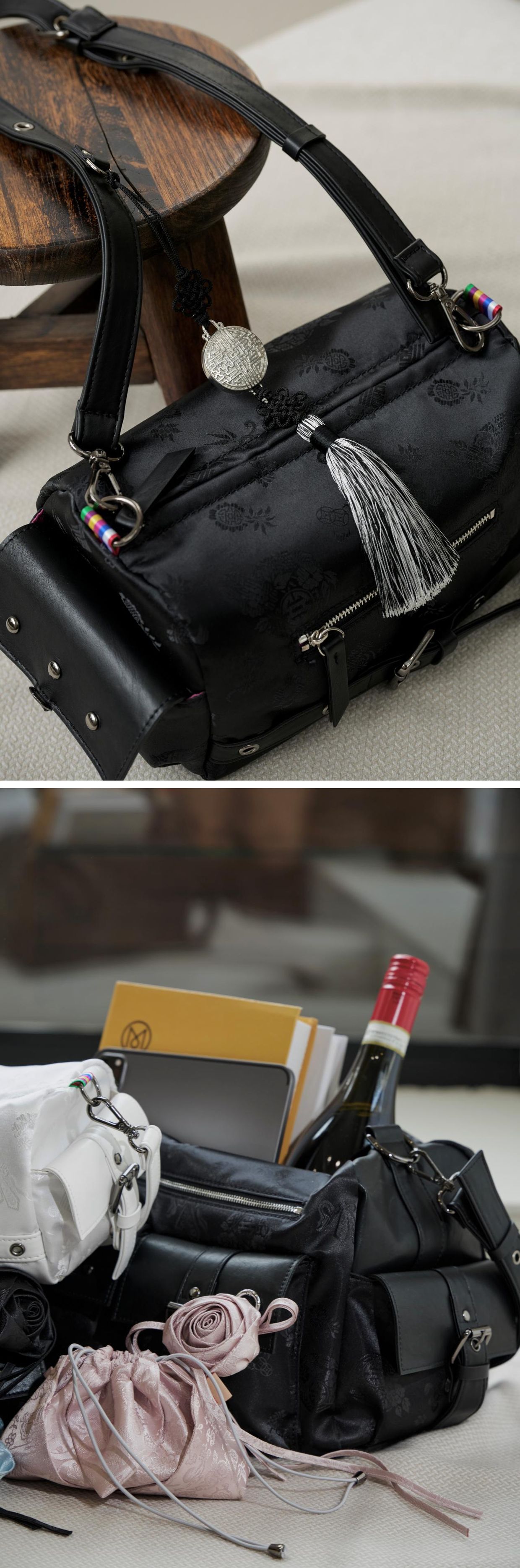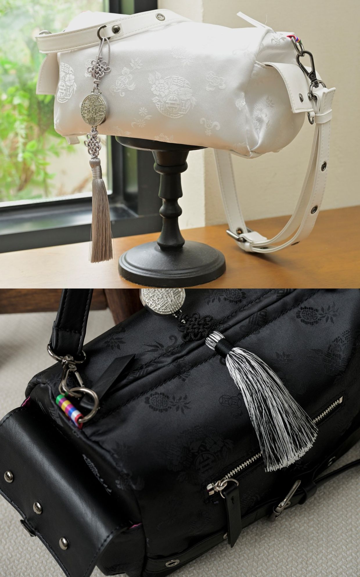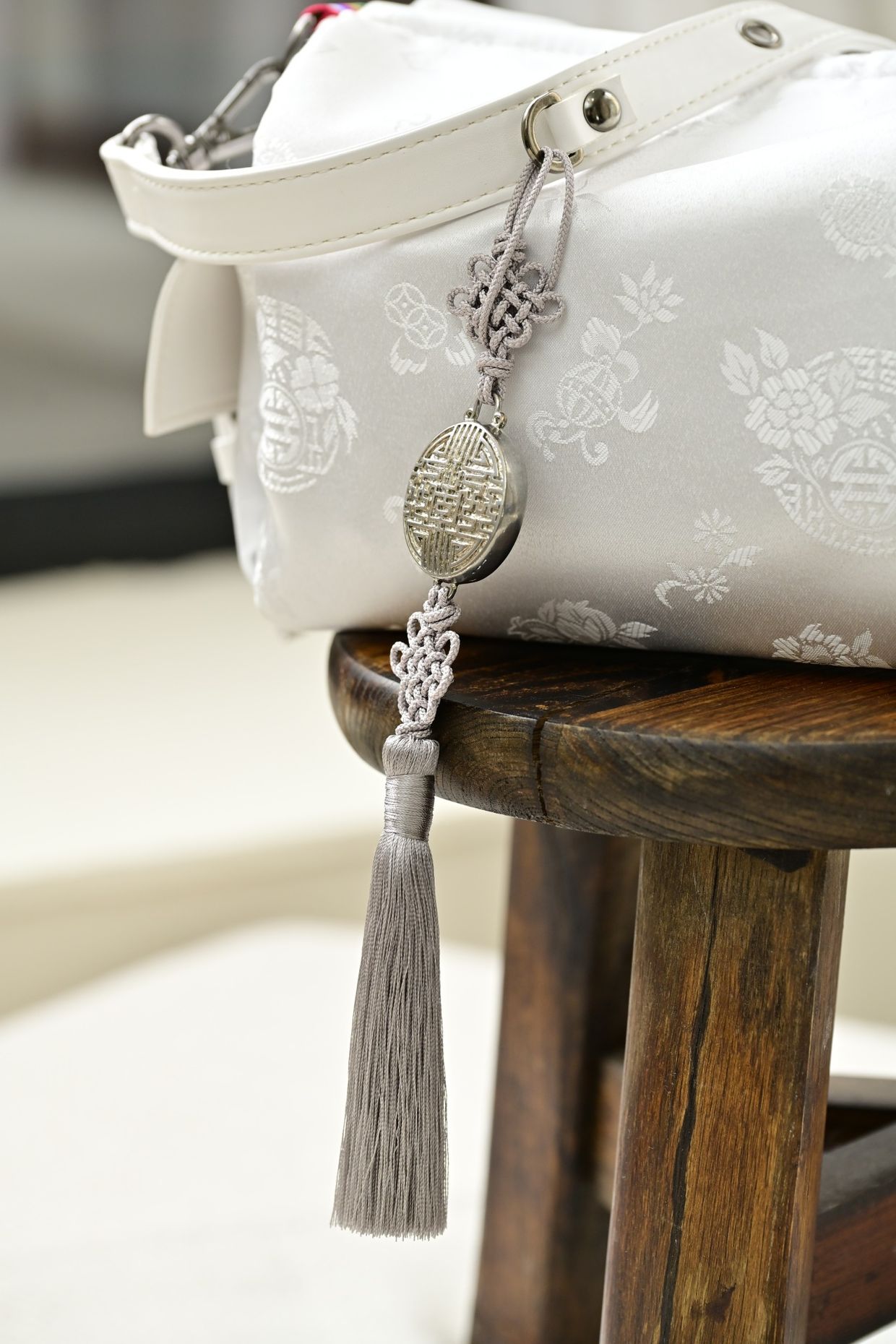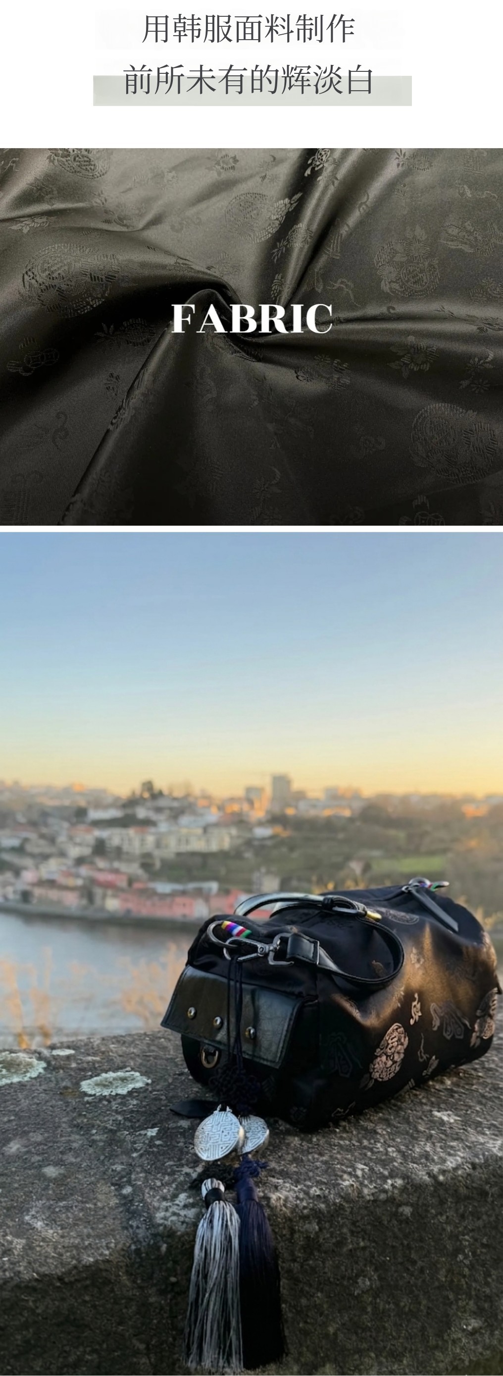 采用传统韩服面料,展现高贵独特的设计。包袋面料图案蕴含独特的传统纹样,更加提升包袋的美感!融合韩服面料特有的美感与素皮的时尚感 的设计。