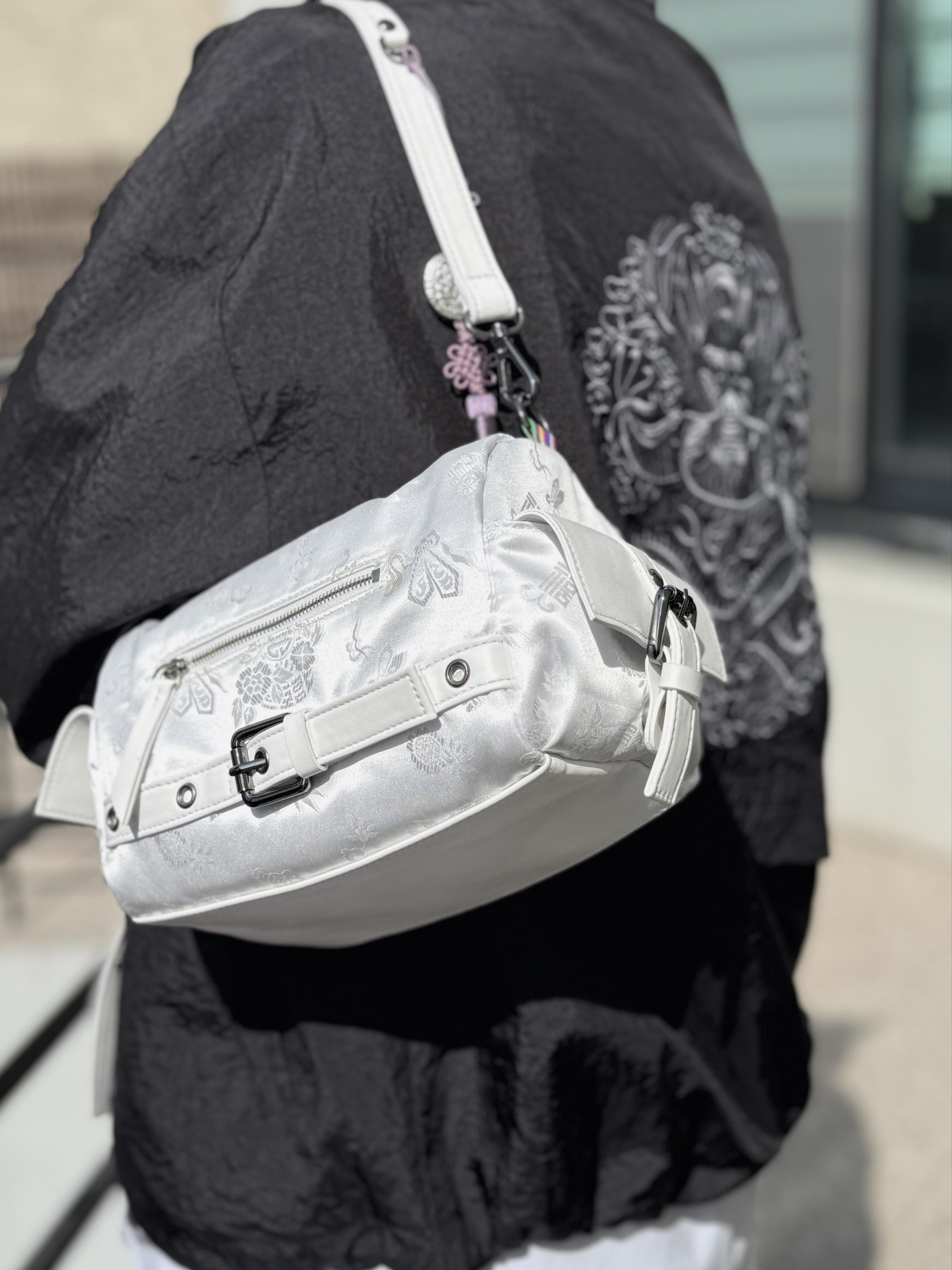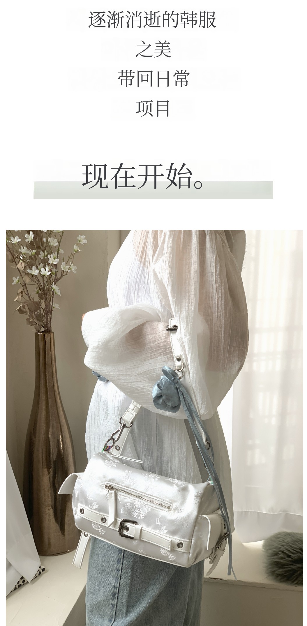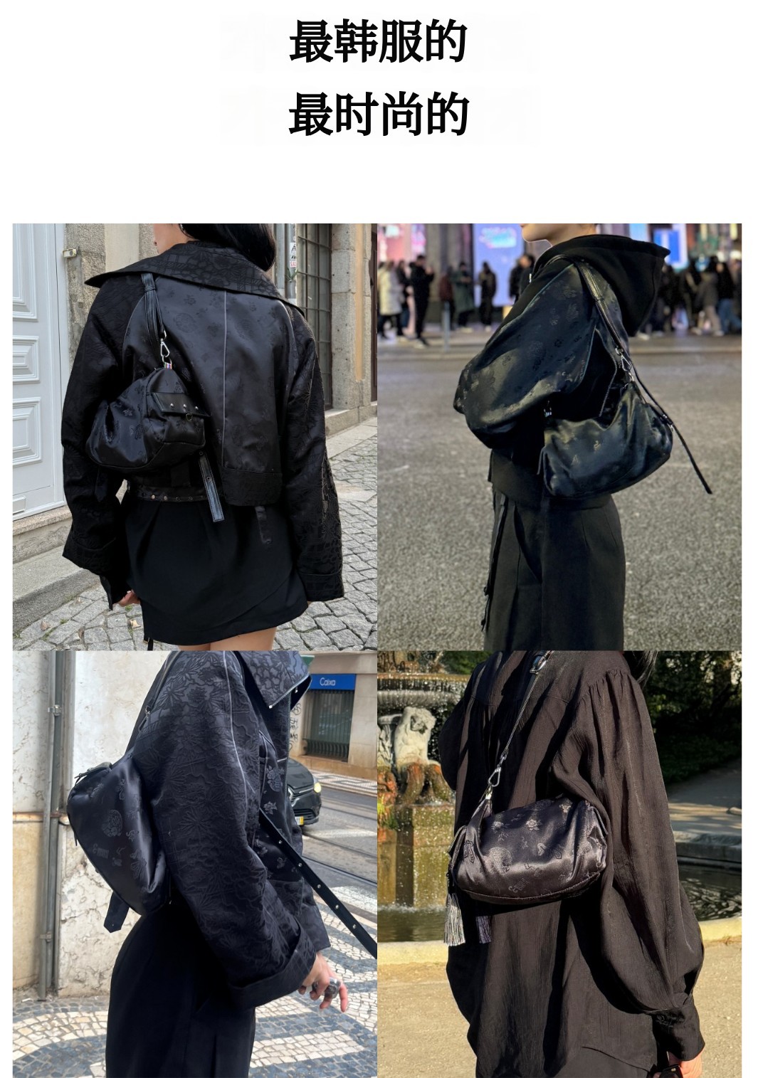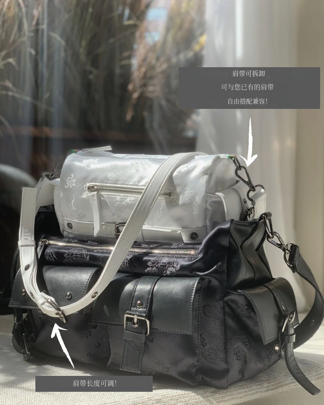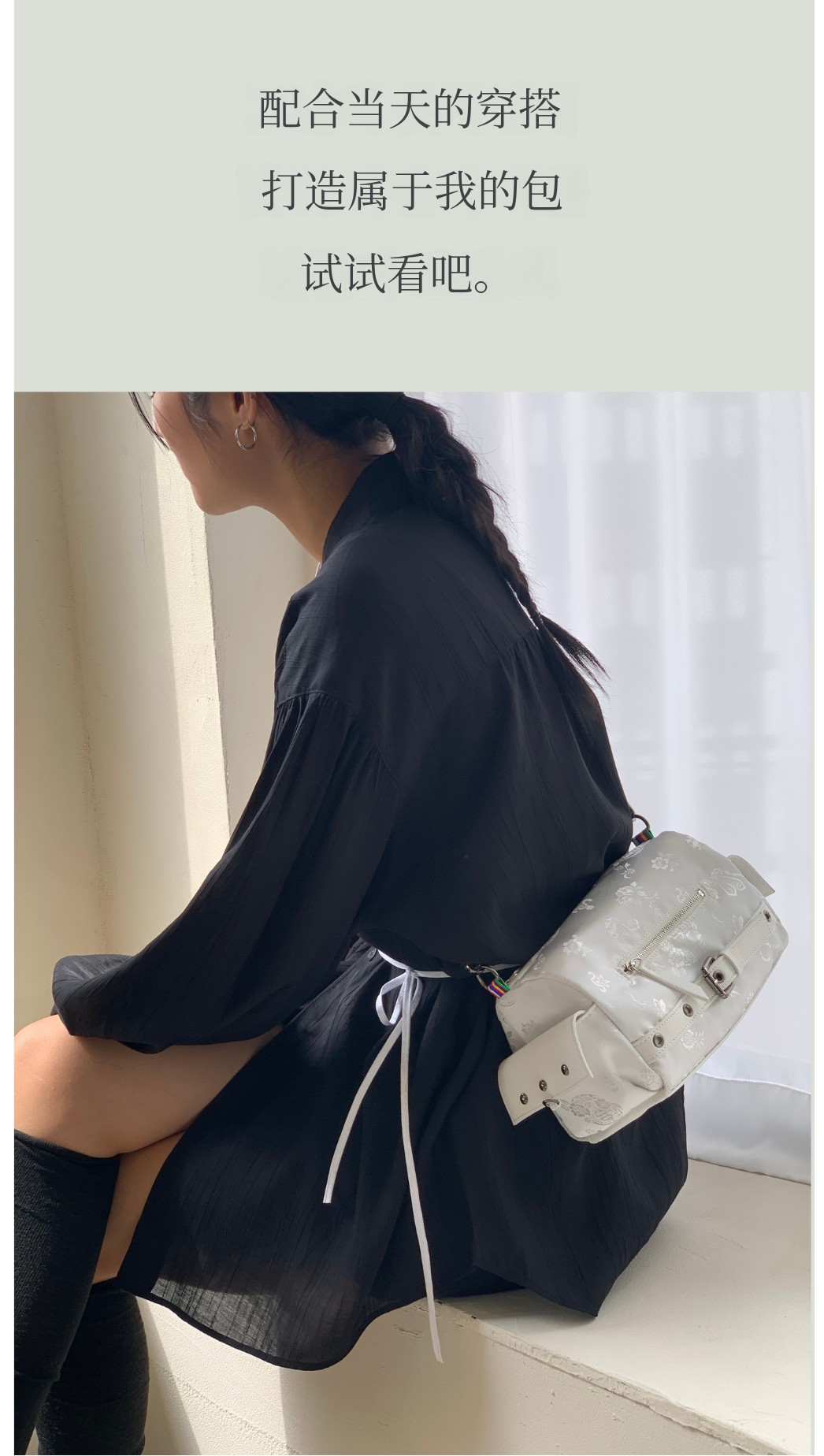 采用传统韩服面料,展现高贵独特的设计。包袋面料图案蕴含独特的传统纹样,更加提升包袋的美感!融合韩服面料特有的美感与素皮的时尚感 的设计。