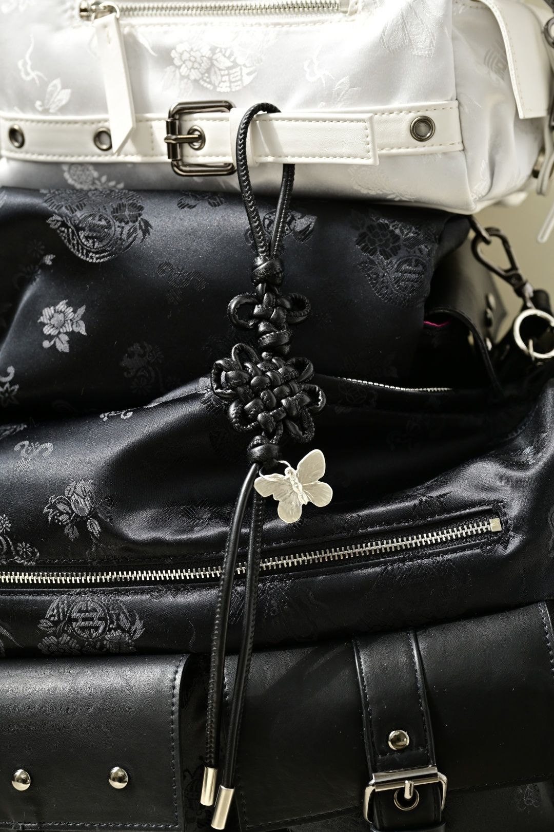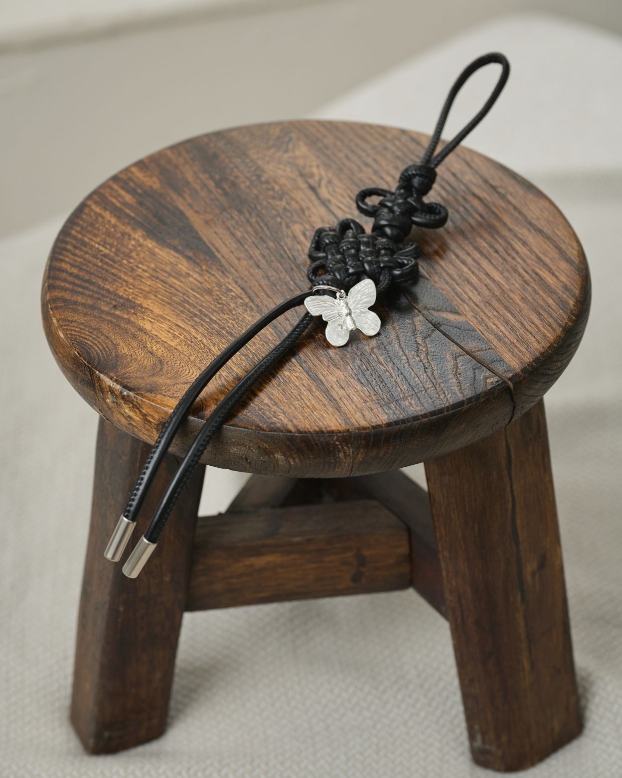 在黑色传统结绳上点缀白色蝴蝶装饰的钥匙扣。