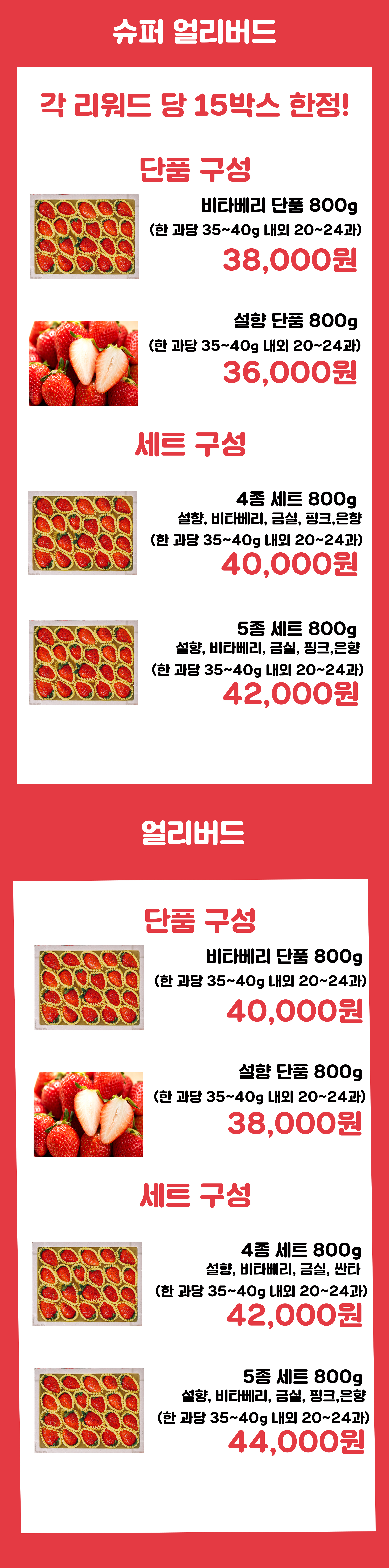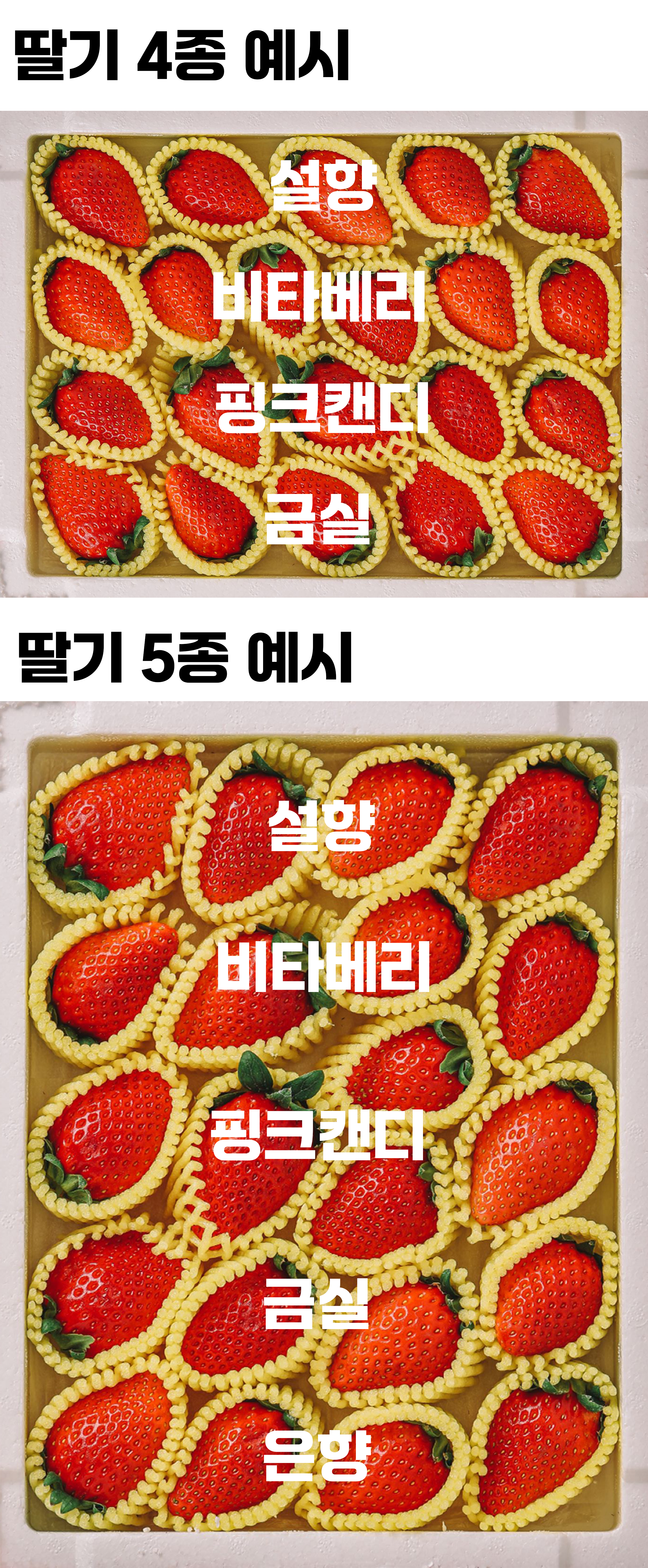총 5가지 품종의 딸기를 마음껏 골라 담을 수 있는 구성으로 준비했어요
