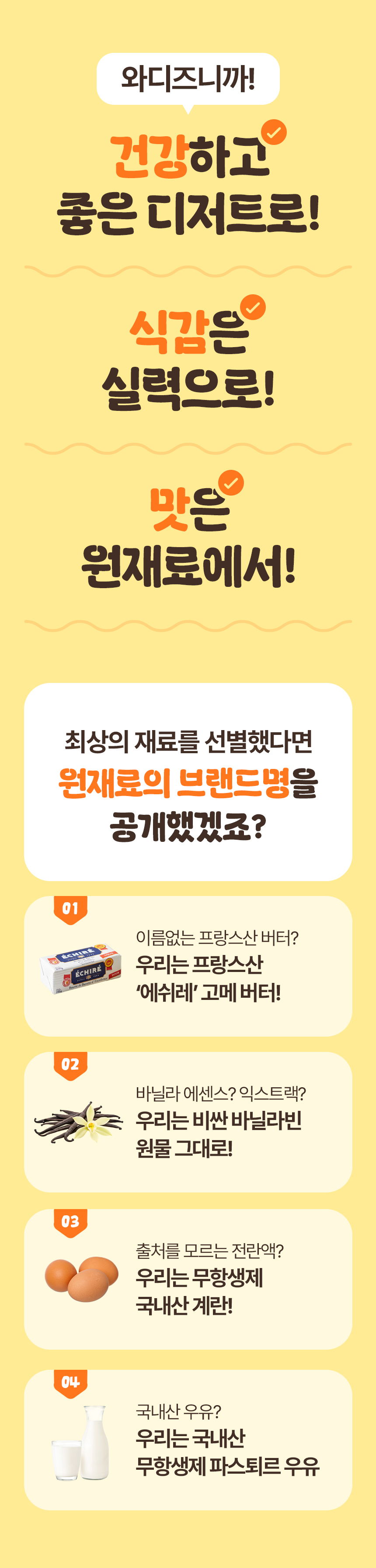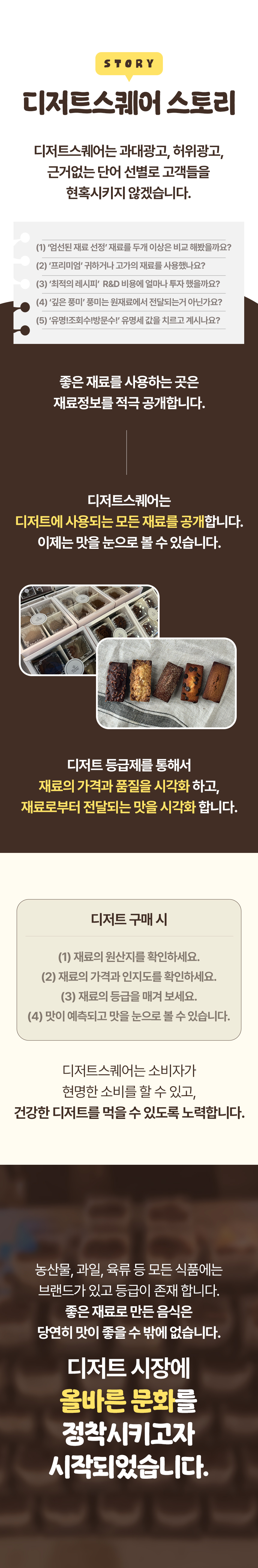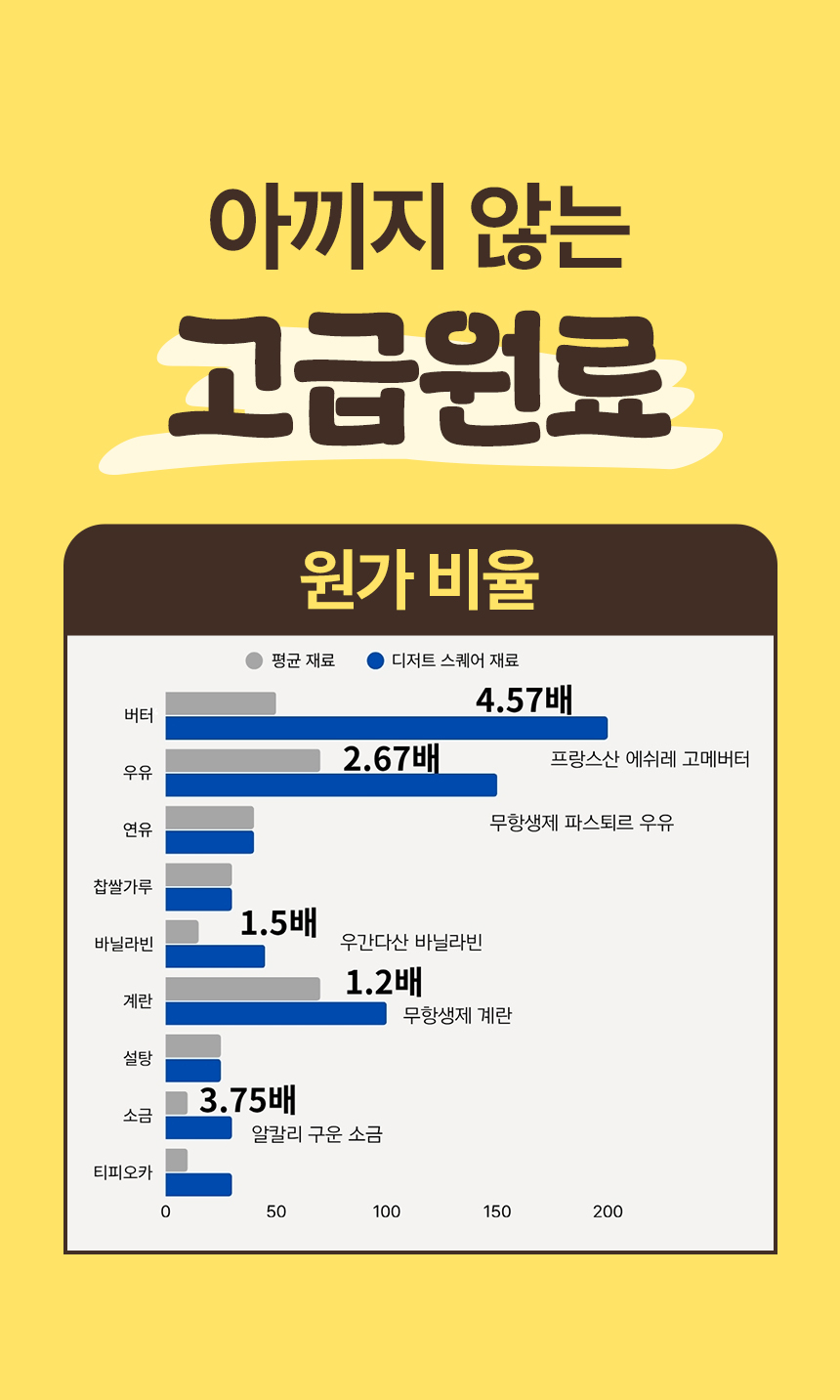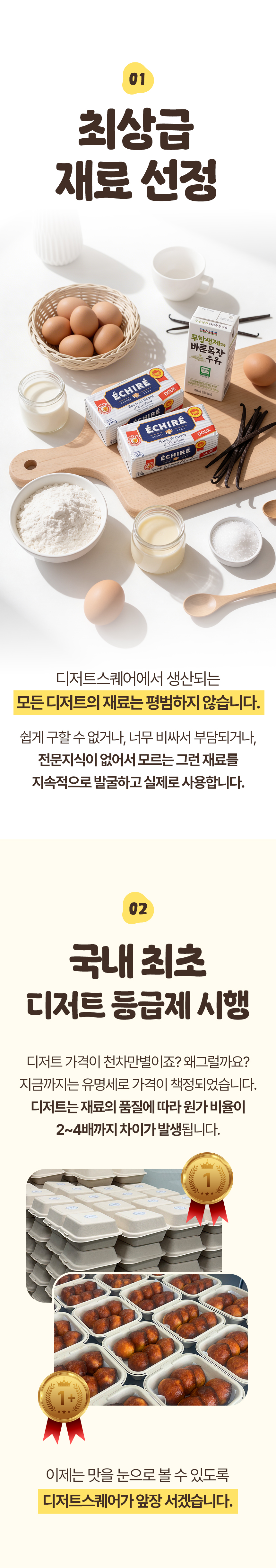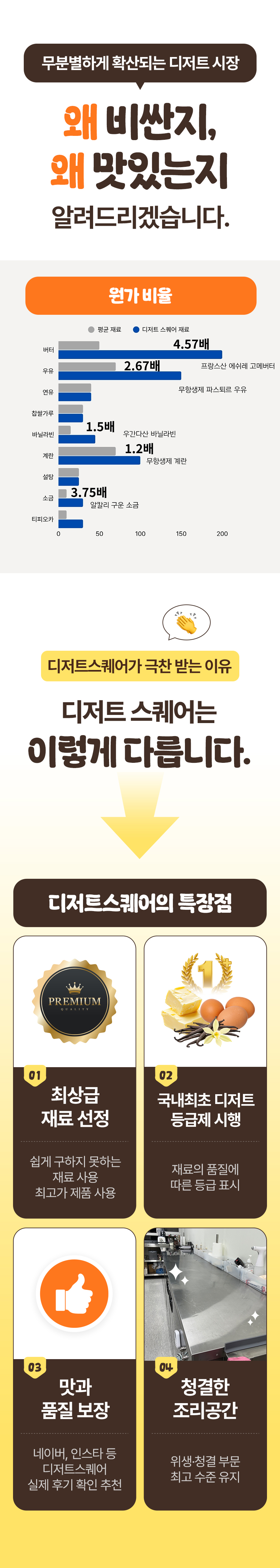 디저트스퀘어에서는 가장 좋은 재료를 사용하여 최상의 맛을 이끌어 내기 위해서 많은 노력을 했습니다. 즉, 원재료로 맛을 확보하고 조리방법으로 식감을 만들었습니다.