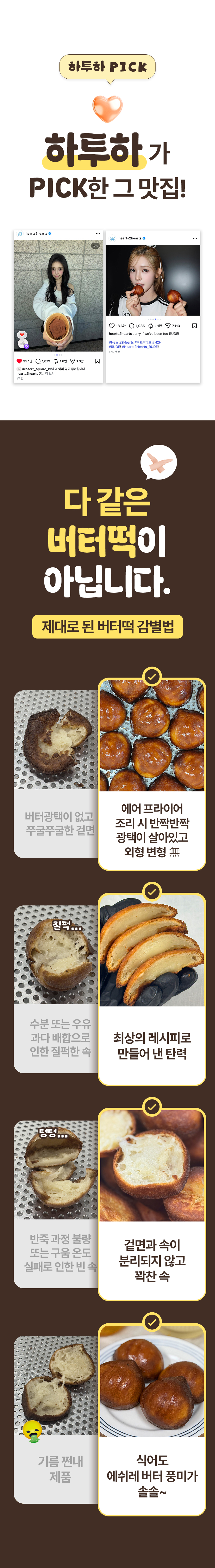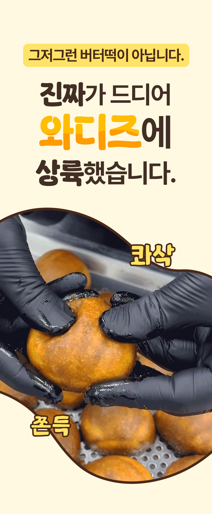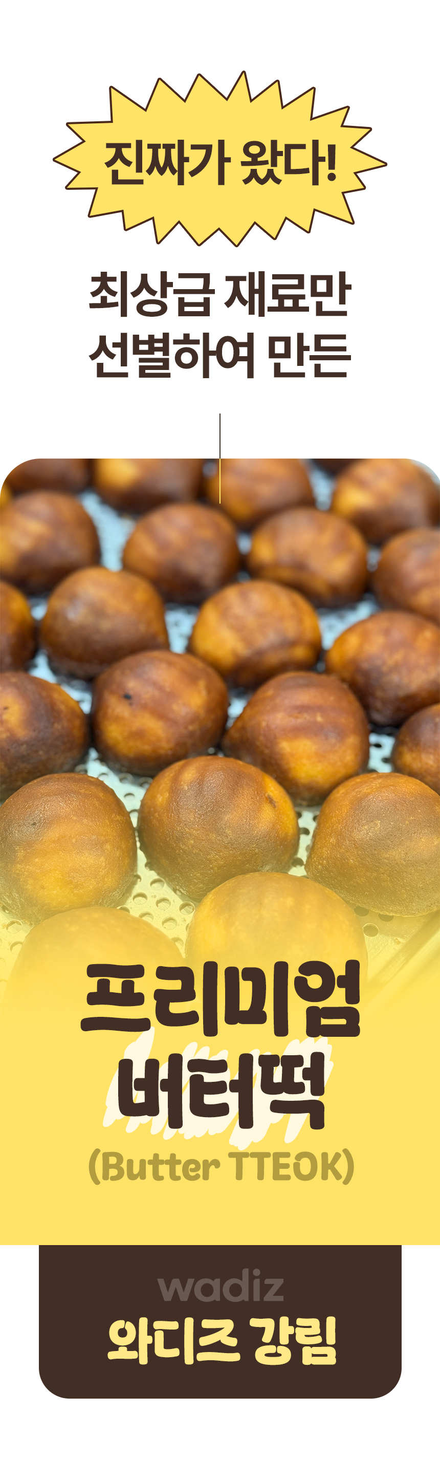 이름에서 전달되듯이 버터의 깊은 풍미와 떡의 쫀듯한 식감이 기본이며, 버터와 찹쌀의 만남으로 겉면이 구워지며 바삭한 식감을 전달받을 수 있습니다.
