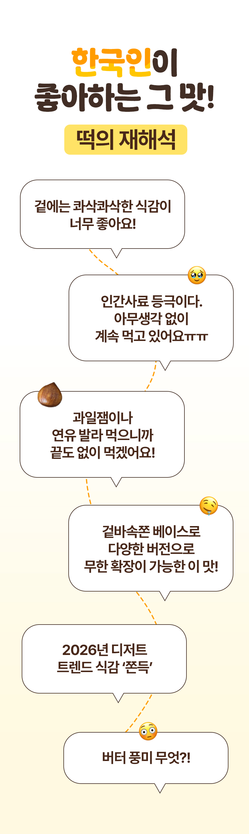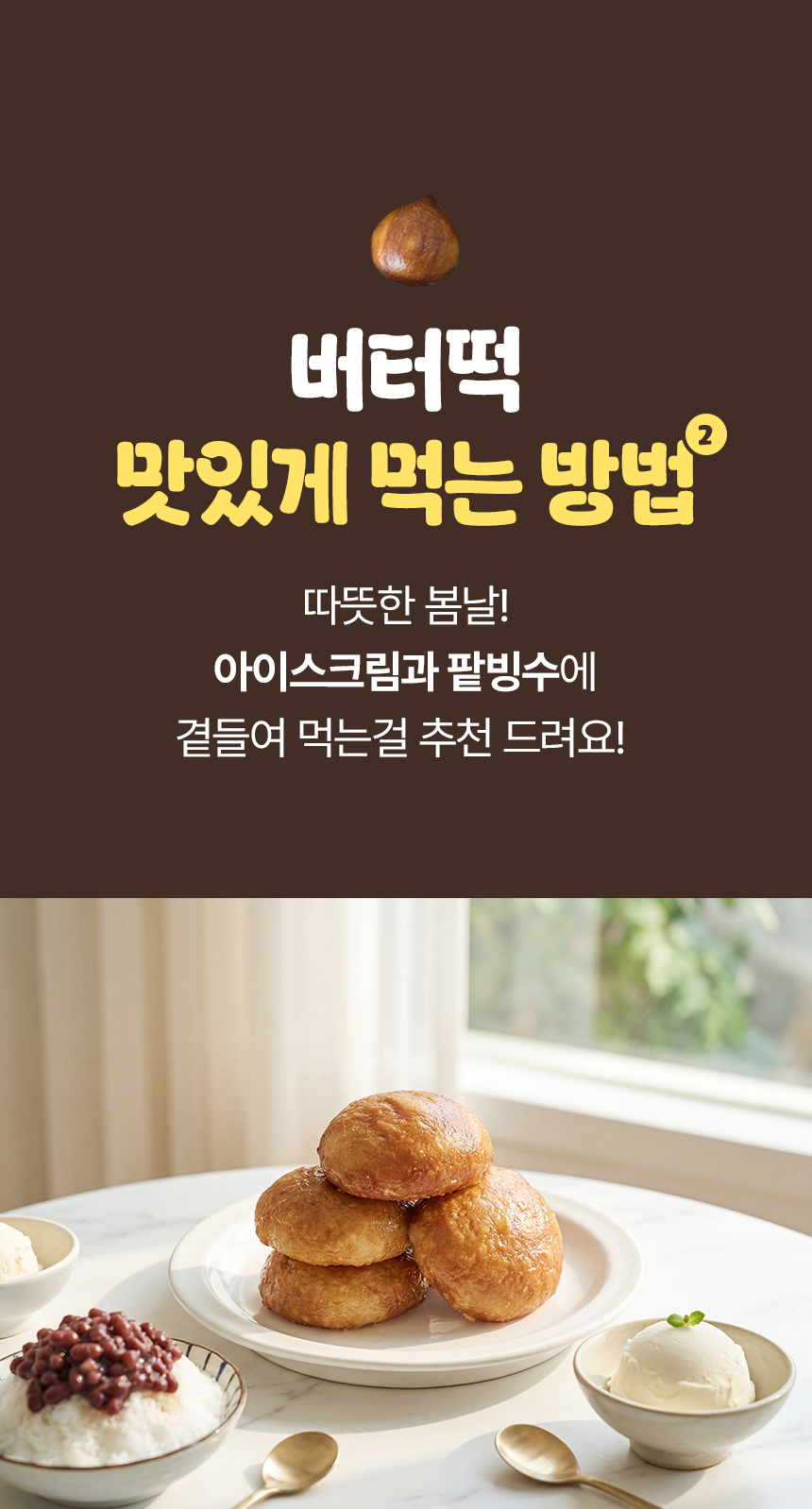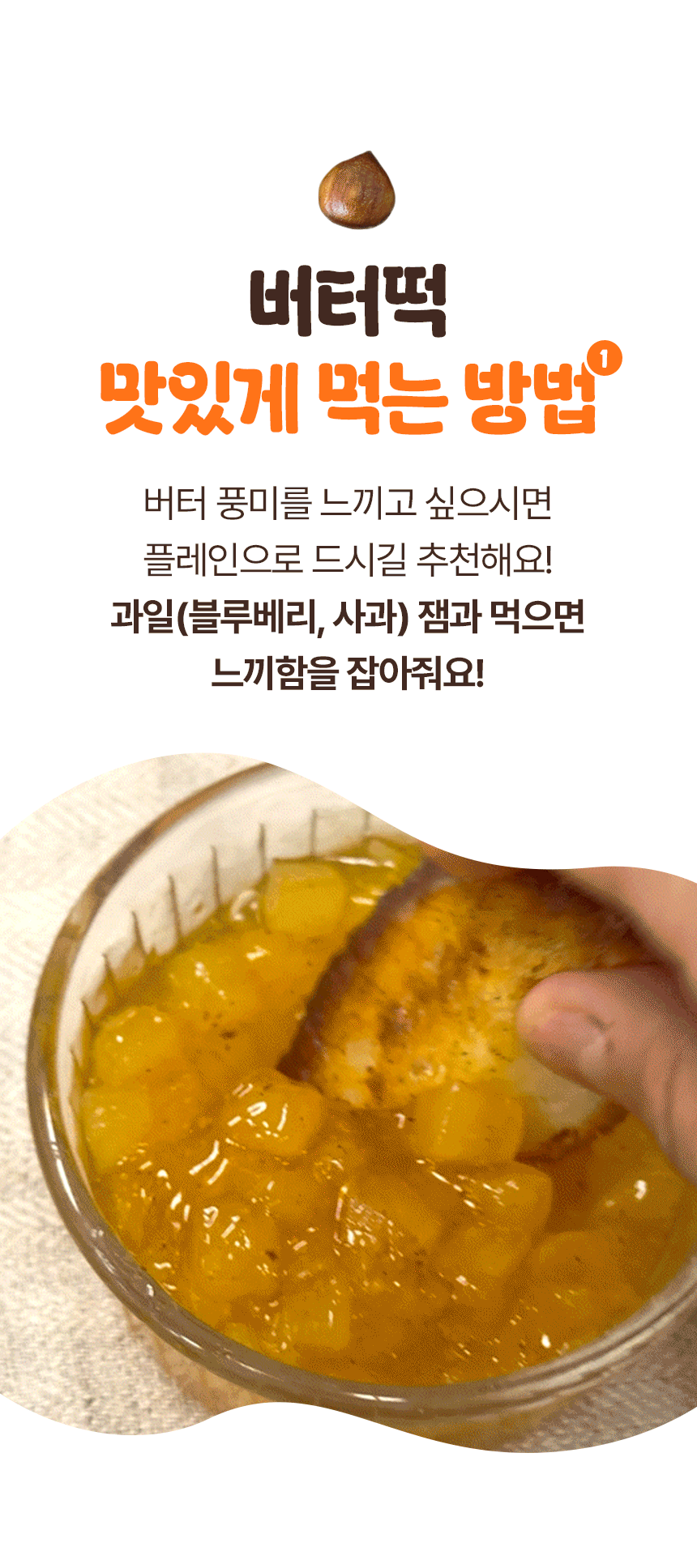 이름에서 전달되듯이 버터의 깊은 풍미와 떡의 쫀듯한 식감이 기본이며, 버터와 찹쌀의 만남으로 겉면이 구워지며 바삭한 식감을 전달받을 수 있습니다.