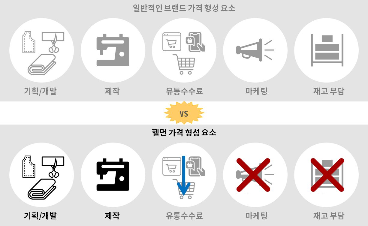 기존 브랜드의 원가에는 기획개발비, 제작비 뿐만 아니라 유통 수수료, 브랜드 프리미엄, 마케팅 비용, 재고 부담 등 여러 요소가 반영되어 있습니다.