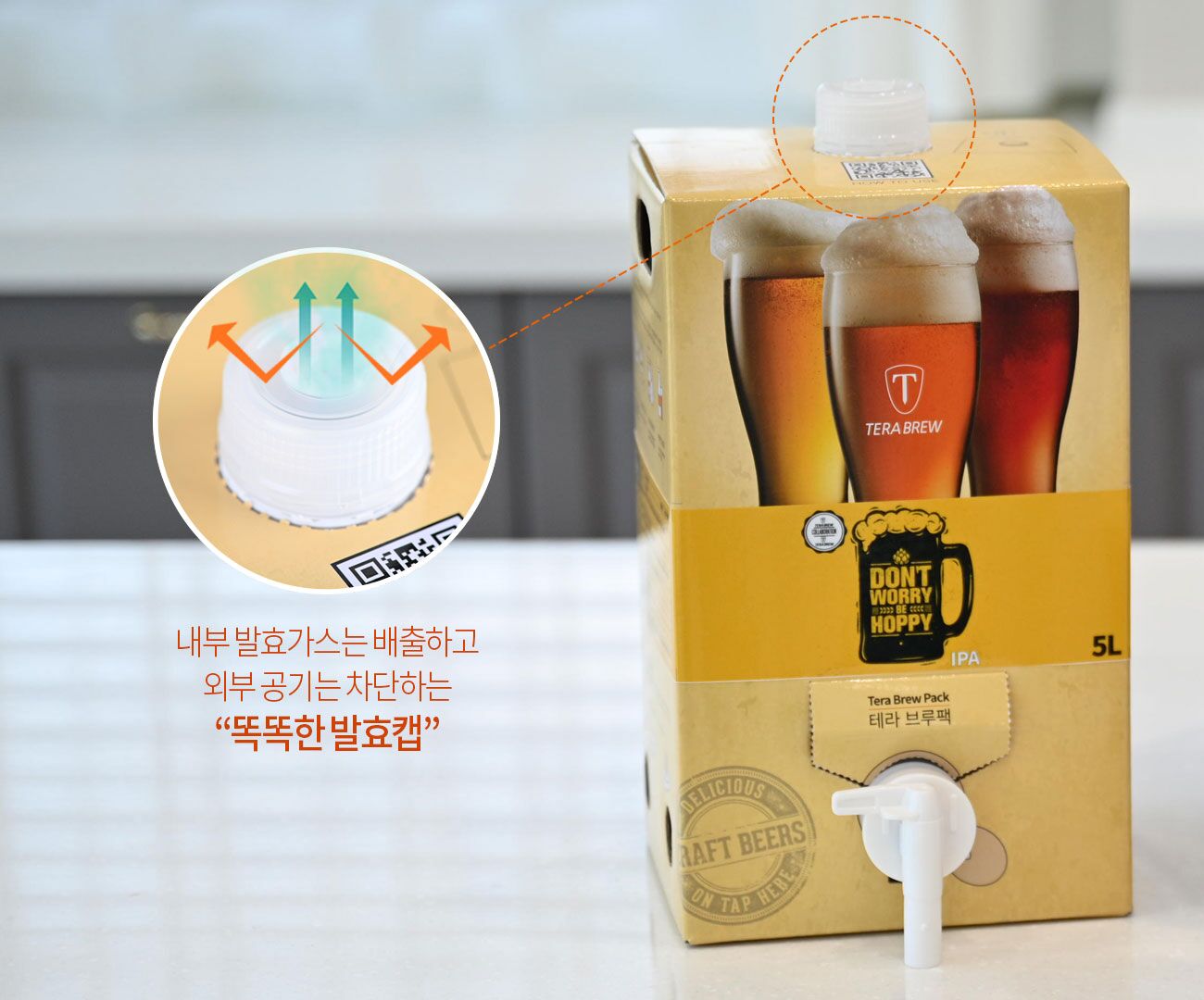 효모가 발효를 하면서 브루팩안에서는 맥주의 알콜과 탄산가스등이 생겨납니다. 그때 발효캡은 외부의 공기는 안으로 못들어오게 해주면서,내부의 탄산가스를 배출해주는 에어락 기능을 하죠. 똑똑한 발효캡은 기본제공합니다.