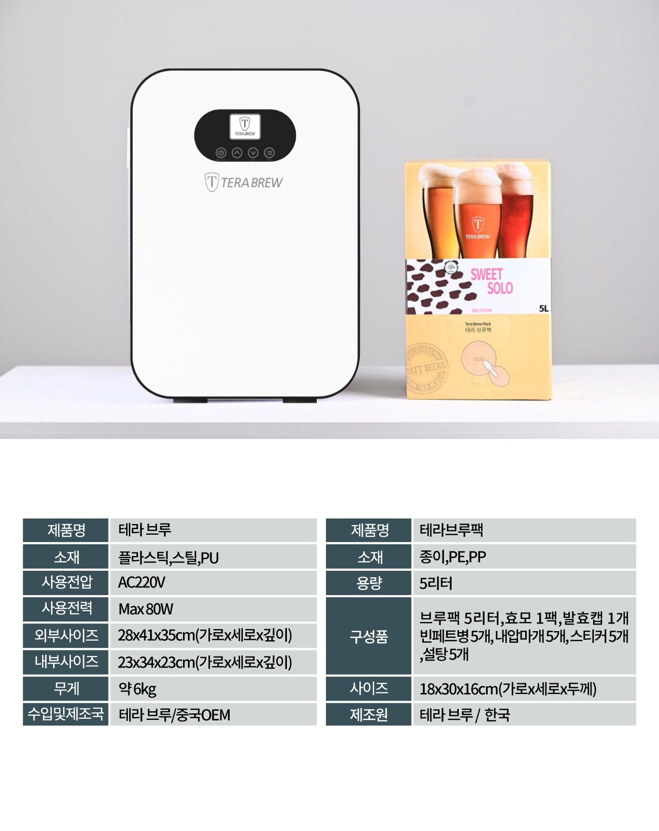 테라 브루 1대 와 테라브루팩 1팩(브루팩 5리터, 효모 1팩,발효캡 1개,빈페트병 5개,내압마개 5개,스티커5개,설탕5개)로 구성되어 있습니다.