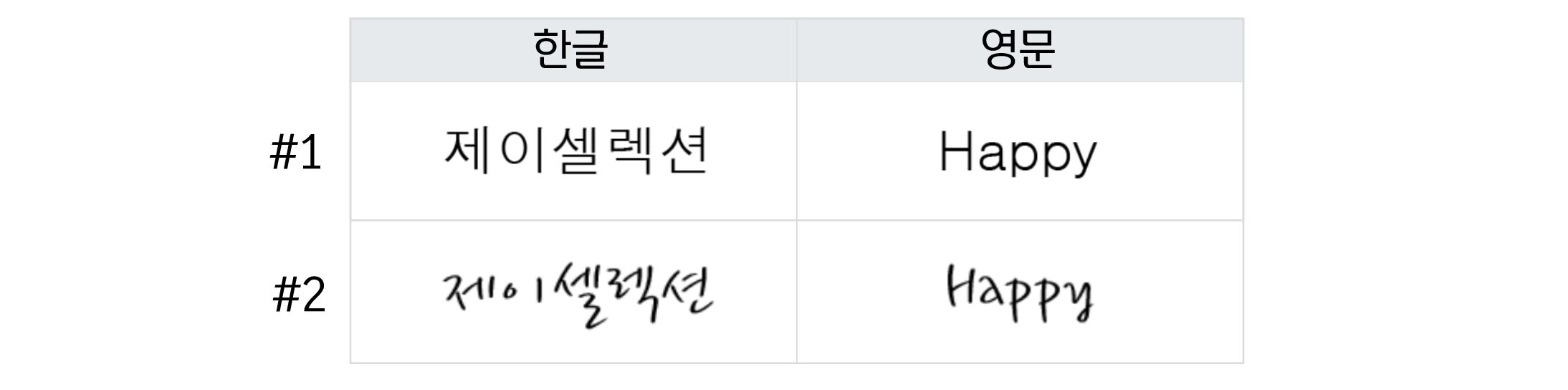 - Step 1. 위의 2가지 폰트 중 1가지를 골라 한글과 영문을 포함하여 총 6글자 이하로 메세지를 담는다. (띄어쓰기 제외)