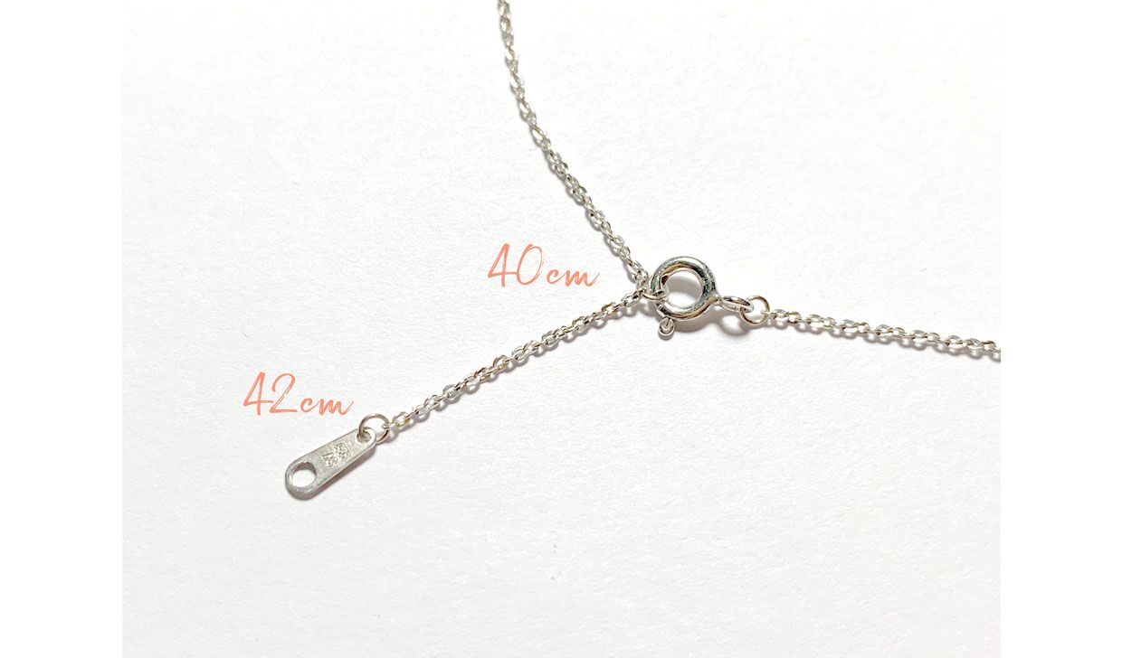 - 목걸이의 체인 길이는 총 42cm이며, 기본 착용 40cm 길이에 연장 가능한 2cm를 추가하여 40cm/ 42cm 2가지 중 원하는 길이에 맞추어 조절하여 착용하실 수 있습니다.
