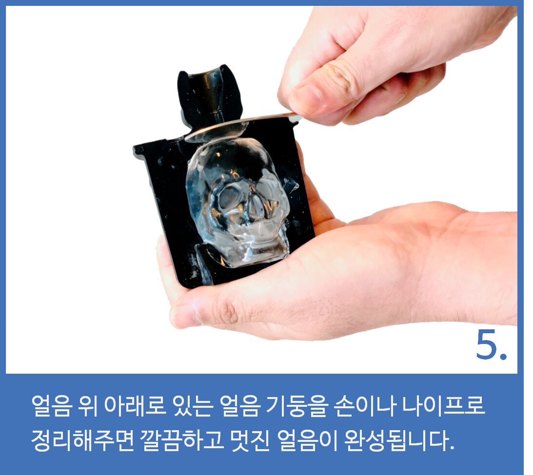 냉각 시간이 부족하여 하단부가 얼지 않은 것입니다. 냉동고 컨디션에 따라 완전히 얼려지는 시간이 다르니 얼리는 시간을 조절해 보세요. 한 번 뺀 얼음은 다시 얼리게 되면 분절 선이 생기므로, 다시 물을 넣고 새롭게 얼려주세요.