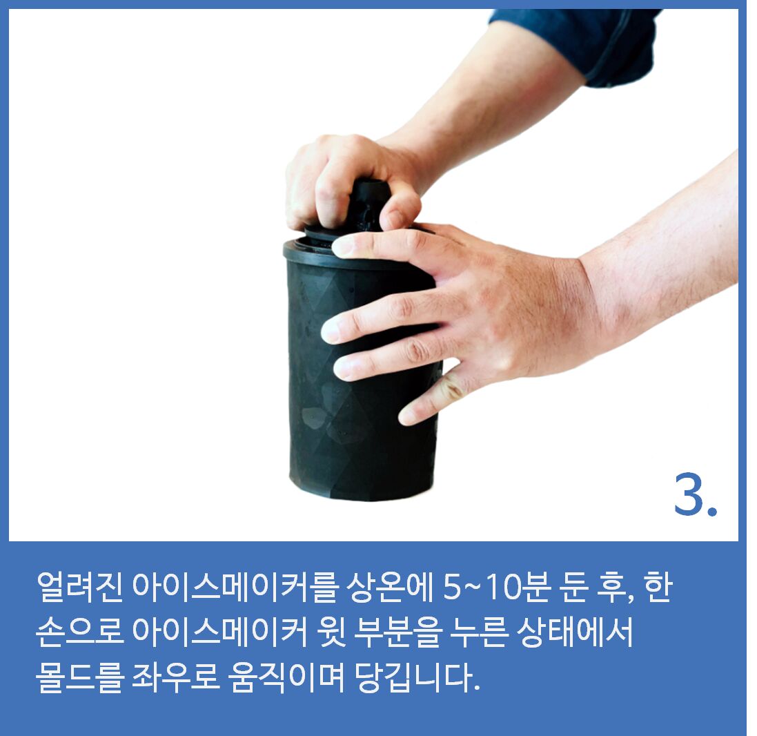 아이스몰드가 메이커와 결합되어 냉각이 되기 때문에 분리가 쉽지 않은 경우가 있습니다. 이런 경우 아이스메이커를 냉동고에서 꺼낸 후 5~10분 정도 후에 분리를 하면 쉽습니다. 한 손으로는 아이스메이커의 상단부를 누르고, 다른 한 손으로 몰드 손잡이를 좌우로 움직이며 당겨주세요.