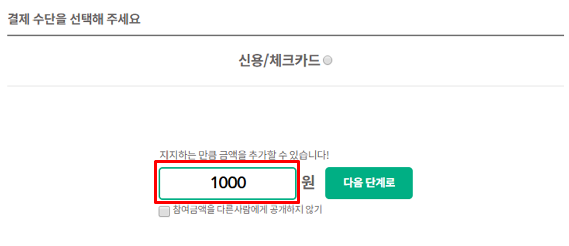 2) [결제 수단을 선택해 주세요] 신용/체크카드 선택 후, 금액 입력란에 후원을 원하는 금액을 입력합니다.