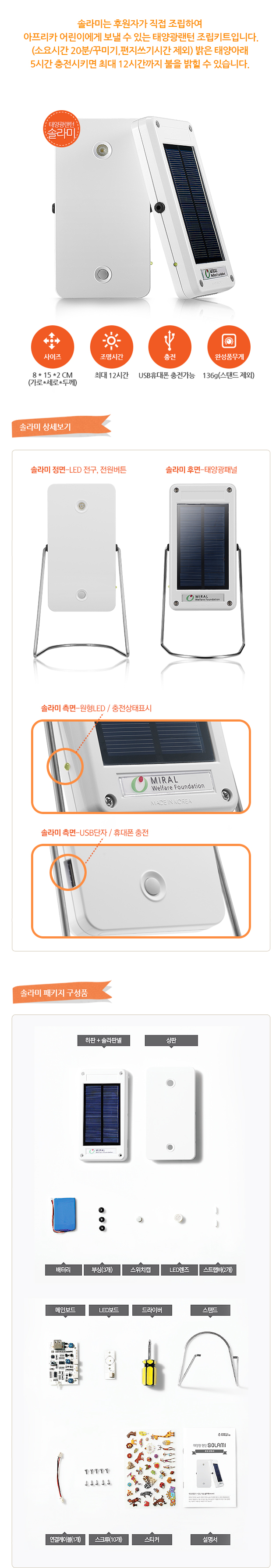 태양광랜턴 솔라미는 후원자가 직접 조립하여 보내주는 랜턴입니다. 조립시간은 약 20분 정도로 남녀노소 누구나 쉽게 조립이 가능하며, 완성한 랜턴을 밀알복지재단으로 보내주시면 아프리카 아이들에게 소중히 전달됩니다.