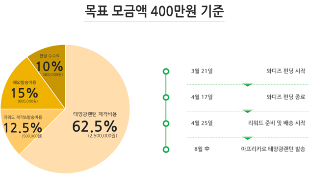 밀알복지재단은 2016년 목표인 '태양광랜턴 1,000개 보내기' 중 100개의 랜턴을 와디즈를 통해 보내고자 합니다. 목표 금액의 사용처는 아래와 같습니다.